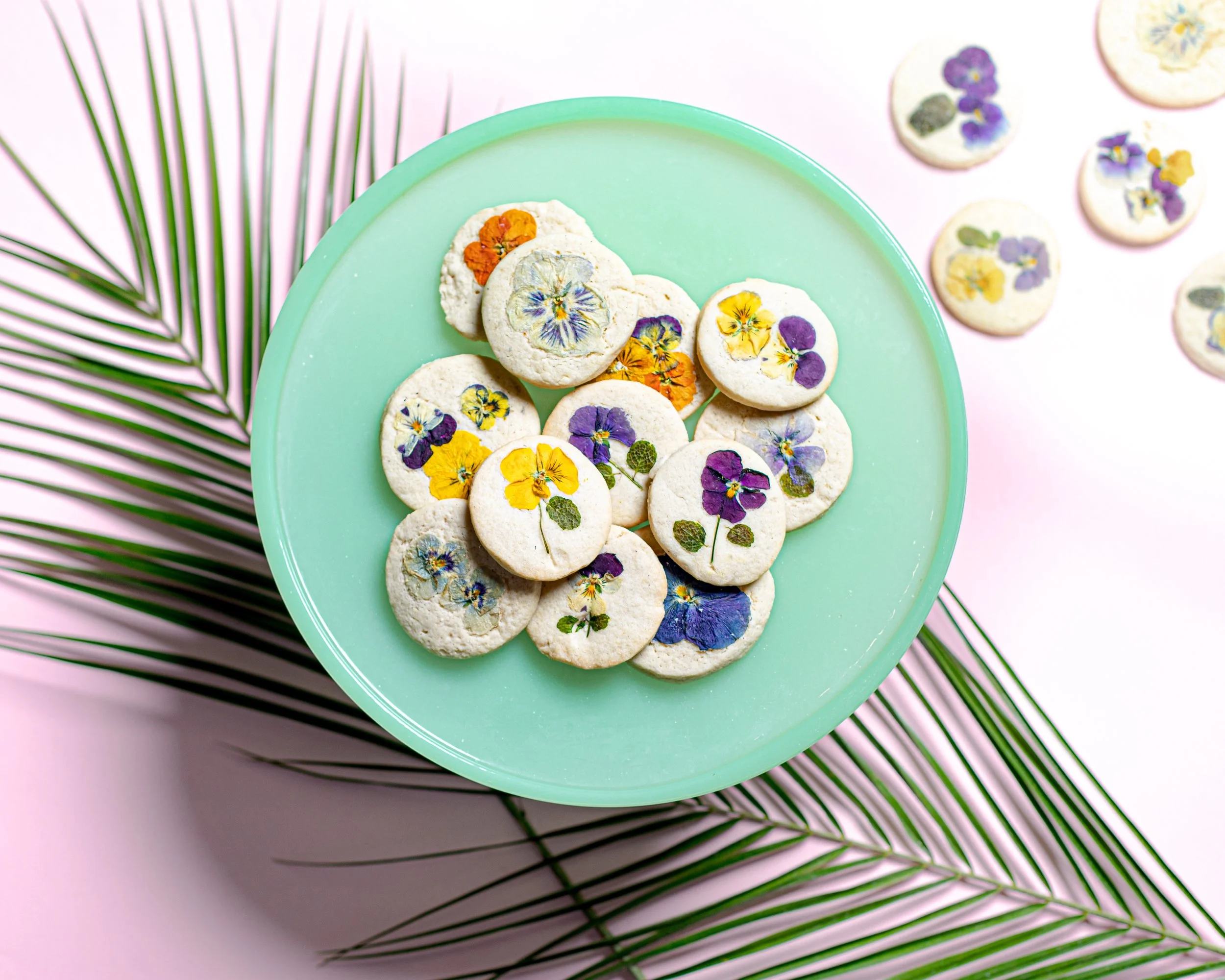 Our artisanal sugar cookies are skillfully decorated using local edible flowers and herbs. Grown in our Baker's own garden, each flower is hand harvested with care and used to create these unique treasures.
